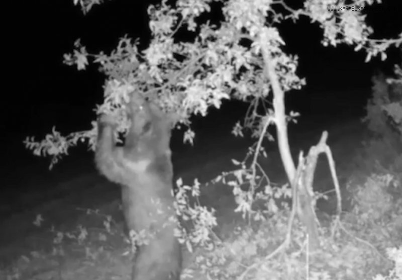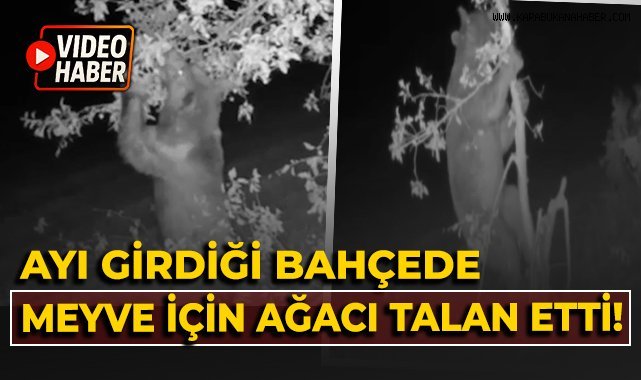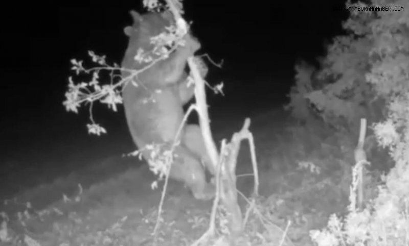 Kastamonu’nun Azdavay ilçesi Mehmetçelebi köyünde yiyecek arayan bir ayı, gece saatlerinde bir evin bahçesine girdi. Ayı bahçede gördüğü meyve ağacına tırmanarak meyveleri tek tek toplayarak yedi. Ayı meyveler için adeta ağacı talan etti. O anlar ise vatandaş tarafından bahçeye yerleştirilen güvenlik kamerasına yansıdı.