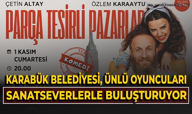 Karabük Belediyesi, kültür ve sanat etkinlikleri kapsamında ünlü oyuncular Çetin Altay ve Özlem Karaaytu’nun rol aldığı komedi oyunu **“Parça Tesirli Pazarlar”**ı tiyatroseverlerle buluşturacak. 1 Kasım Cumartesi günü saat 20.00’de 100. Yıl Kültür Merkezi’nde sahnelenecek oyun ücretsiz olarak izlenebilecek. Belediye Başkanı Özkan Çetinkaya, tüm Karabüklüleri sanat dolu ve keyifli bir akşama davet etti.