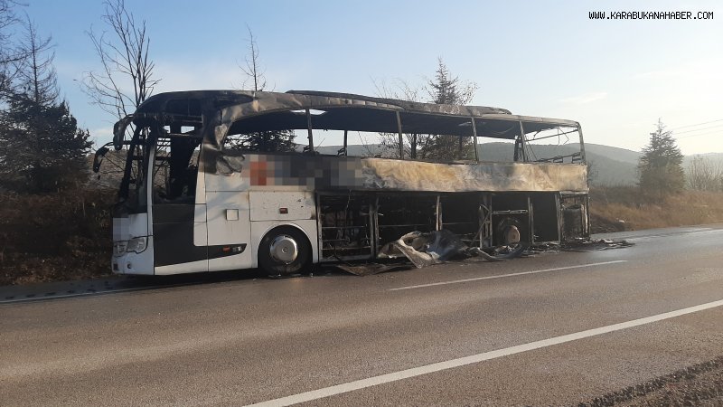 Karabük'ün Eskipazar ilçesinde seyir halindeyken motor kısmından alev alan yolcu otobüsü tamamen yanarak kullanılamaz hale geldi.