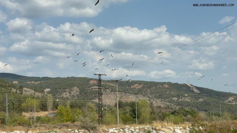 Karabük’te Soğanlı Çayı kıyısında toplanan çok sayıda leylek, dronla görüntülendi. Yüksek gerilim direğine yapılan riskli yuva da dikkat çekti.