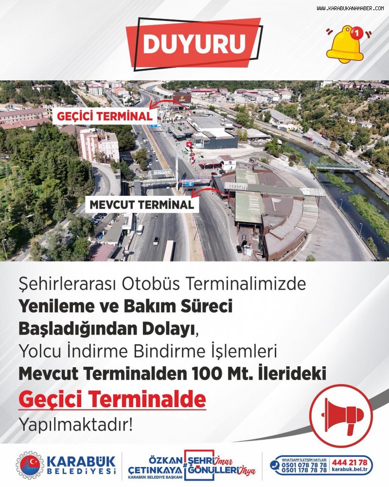 Karabük Belediye Başkanı Özkan Çetinkaya, şehir terminalinde yenileme ve bakım çalışmalarının başladığını duyurdu. Çetinkaya, çalışmalar süresince yolcu indirme-bindirme işlemlerinin mevcut terminalin 100 metre ilerisinde oluşturulan Geçici Terminal alanında yapılacağını belirtti.