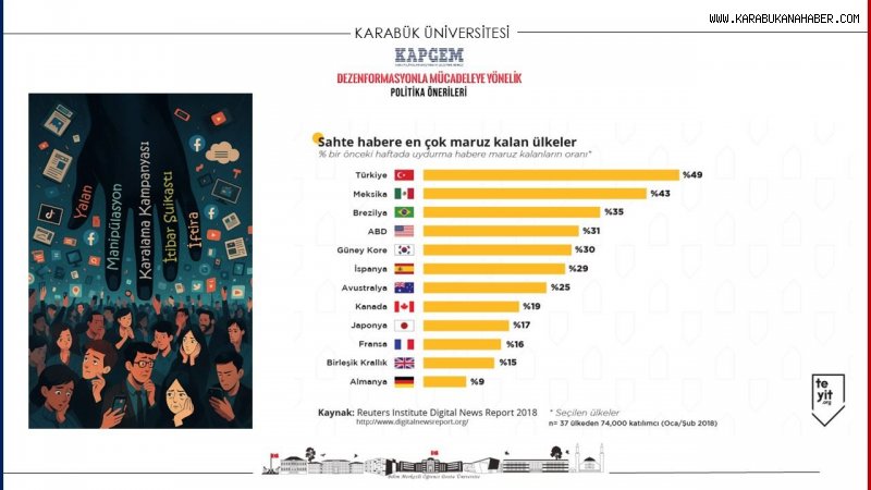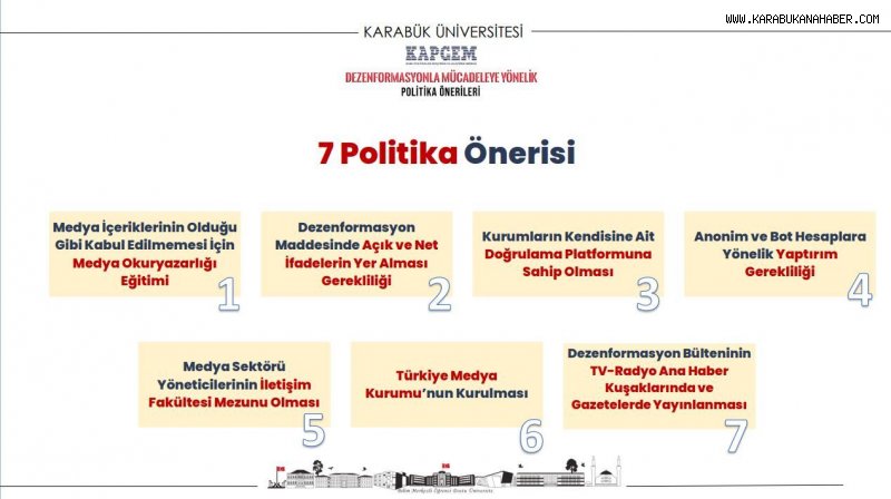 Karabük Üniversitesi Kamu Politikaları Araştırma ve Geliştirme Merkezi (KAPGEM), Türkiye’de artan sahte haber ve bilgi kirliliğine karşı hazırladığı “Dezenformasyonla Mücadeleye Yönelik Politika Önerileri” raporunu tanıttı. Rapor, bireysel, kurumsal ve sistem düzeyinde uygulanabilecek yedi somut politika önerisi sunuyor. Tanıtım toplantısına Rektör Prof. Dr. Fatih Kırışık, RTÜK Üyesi Dr. Deniz Güçer, akademisyenler ve öğrenciler katıldı.
