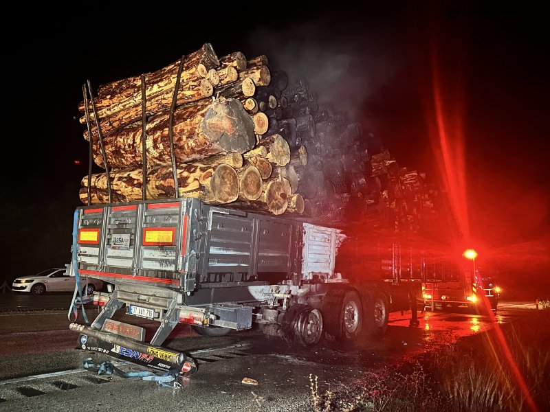 Olay, Ankara-Kastamonu karayolu Kadı Dağı mevkiinde meydana geldi. Edinilen bilgiye göre, Çankırı’dan Kastamonu’da bulunan bir fabrikaya tomruk taşıyan İ.Ş. idaresindeki 37 AAY 716 plakalı tırın dorsesinin lastiklerinden yangın çıktı. Durumu fark eden sürücü, tırı yol kenarında durdurarak 112 Acil Çağrı Merkezini aradı. İhbar üzerine olay yerine gelen itfaiye ekiplerinin müdahalesiyle, tomruklara da sıçrayan yangın söndürüldü.