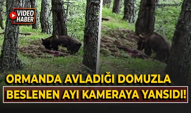 Ormanda avladığı domuzla beslenen ayı kameraya yansıdı