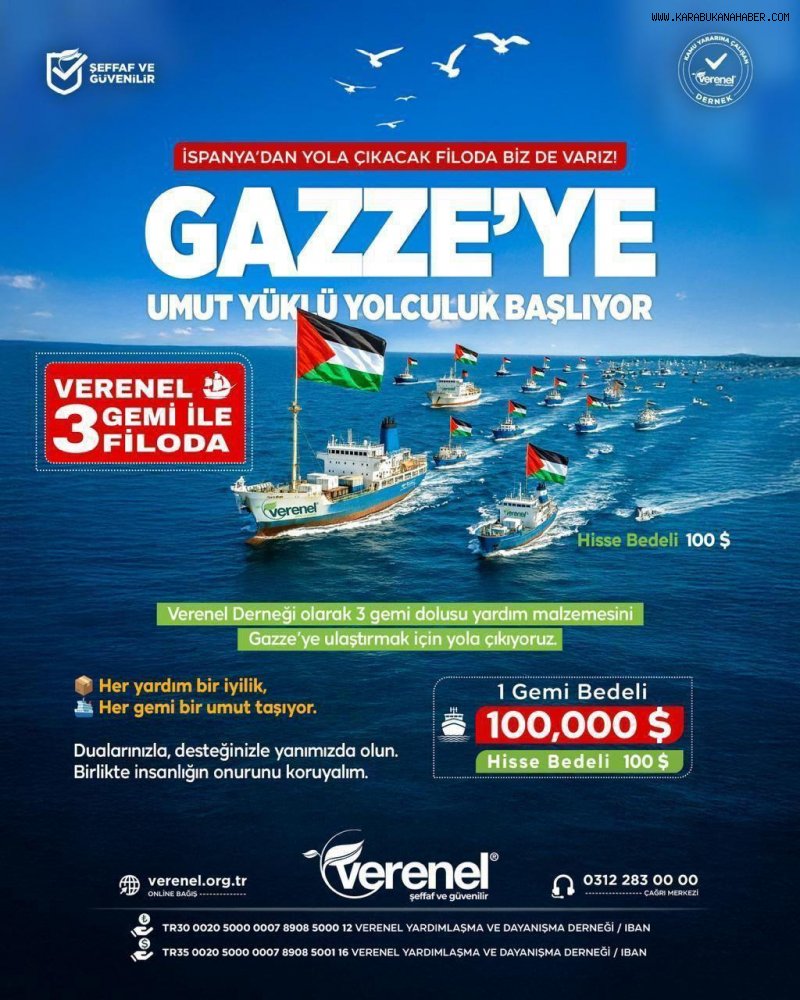 Gazze’de süren kuşatma ve insani krize karşı 44 ülkeden 50’den fazla geminin katılımıyla oluşturulan “Umut Filosu”, yardımları ulaştırmak üzere Akdeniz’den yola çıktı. Türkiye’den Verenel Derneği de üç gemiyle filoya katılarak gıda, ilaç ve tıbbi malzemelerle Gazze halkına destek götürüyor.Verenel Derneği’nden yapılan açıklamada, “Her yardım bir iyilik, her gemi bir umut taşıyor. Bizler de bu filonun bir parçası olarak insanlığın onurunu korumak için yola çıkıyoruz. Gazze’ye Verenel oluyoruz” denildi.Dernek ayrıca, bugün Gazze gönüllülerinin Tunus’a ulaştığını, gönüllülerle birlikte bir dizi eğitimlerin ardından sefere çıkacaklarını duyurdu. Açıklamada, gemilerde sanatçı ve aktivistlerin de yer aldığı gönüllü grubunun büyük bir istekle bu sefere katılmak istediği belirtilerek, “Allah bu seferimizi zafer ile sonuçlandırsın. Gayret bizden, tevfik Allah’tan” ifadeleri kullanıldı. Genel