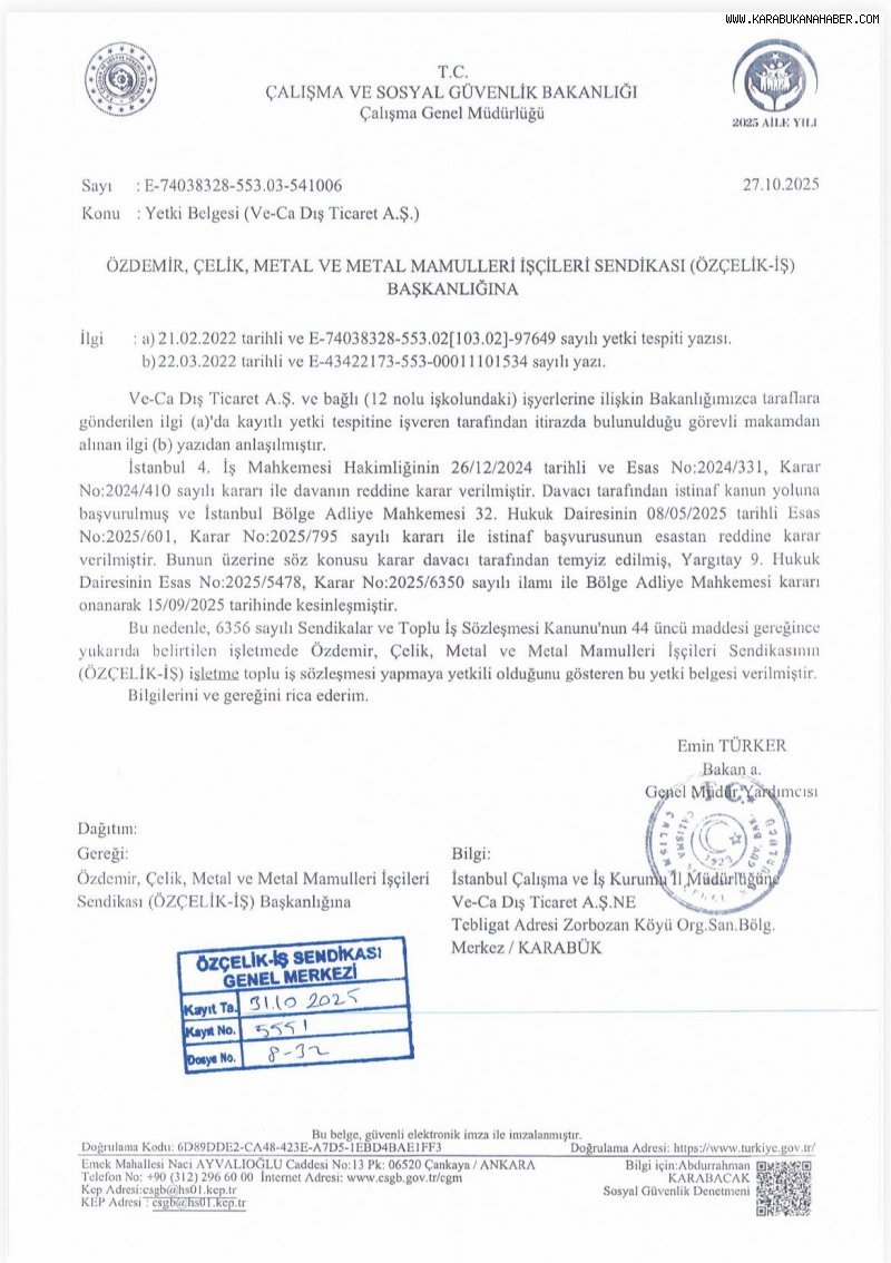 Ve-Ca Demirçelik’te 2022 yılında tamamlanan sendikal örgütlenme sürecinin ardından 3 yıldır devam eden yetki tespiti itirazına ilişkin dava sonuçlandı. Mahkemenin Özçelik-İş Sendikası lehine karar vermesiyle birlikte sendikanın yetkisi kesinleşti.